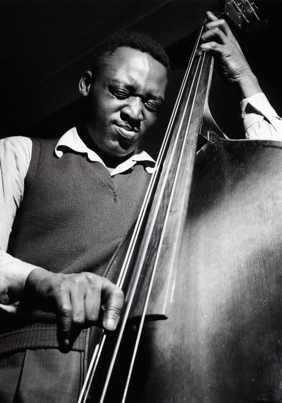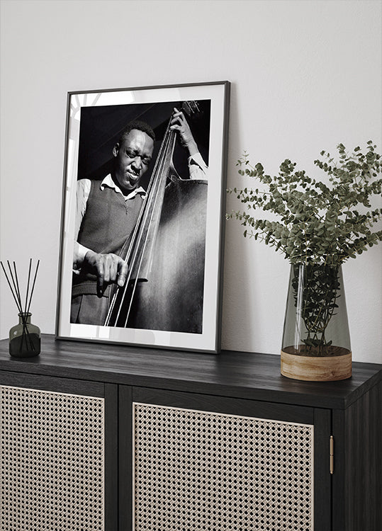 Una potente fotografia in bianco e nero che cattura la passione e l'intensità di un musicista jazz che suona il contrabbasso. L'illuminazione drammatica e la composizione espressiva sottolineano il profondo legame tra l'artista e il suo strumento. Un tributo senza tempo al jazz, alla musica e all'espressione artistica, perfetto per gli amanti della musica e gli appassionati di fotografia vintage.