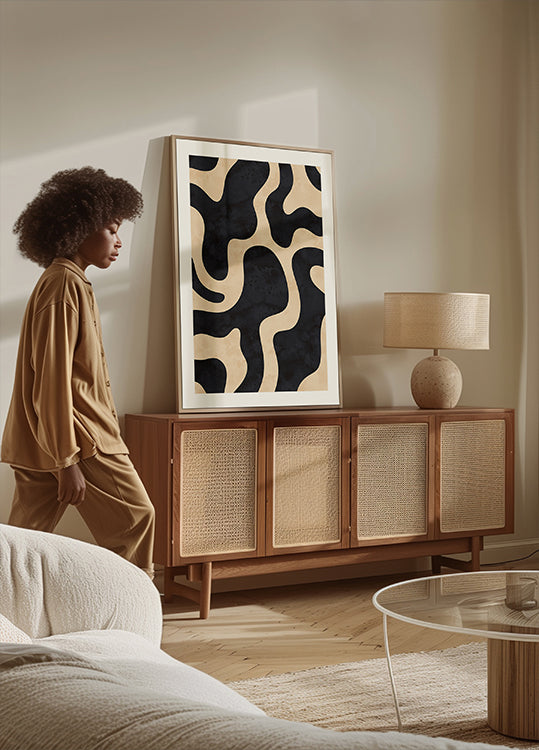 Un moderno poster astratto ispirato a Picasso, con linee nere vorticose che formano un intricato motivo di rose. La palette di nero e beige ad alto contrasto ne esalta l'espressione artistica e sofisticata. Un omaggio all'arte contemporanea e astratta, perfetto per interni moderni e amanti dell'arte.