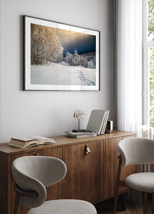 En stille vintersti slynger sig gennem en dyb skov, hvor frosttunge graner og fine spor i sneen leder blikket mod et blødt, tåget morgenlys. Den kølige palet og den rene horisont skaber nordisk ro og eftertanke. Et stemningsfuldt naturmotiv af fotografen Christophe Baudot. Perfekt til at indramme vinterens stille poesi.