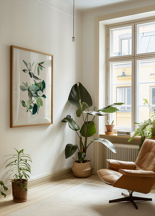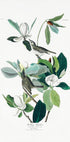 Arte botanica vintage con fiori di magnolia e raffigurazioni dettagliate di uccelli. Un'illustrazione della natura elegante e intricata che mette in risalto il fogliame vibrante in una composizione delicata. Perfetto per gli amanti delle stampe botaniche classiche e dell'arte di storia naturale.
