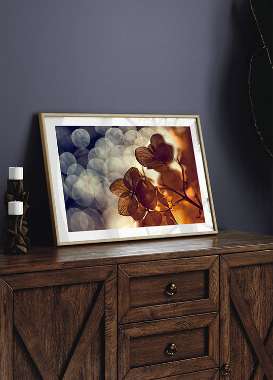 Questa incantevole fotografia macro cattura le foglie essiccate di ortensia che brillano in una calda luce dorata su uno sfondo da sogno con bokeh circolare. Le sottili venature delle foglie forniscono dettagli intricati, mentre l'atmosfera luminosa irradia eleganza, nostalgia e bellezza botanica senza tempo.