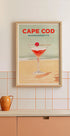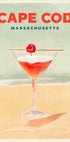 Un vivace poster retrò di Cape Cod, Massachusetts, raffigurante un cocktail classico in un bicchiere da martini sormontato da una ciliegia. Con uno sfondo da spiaggia e toni caldi, questa opera d'arte cattura il fascino costiero, il relax e l'atmosfera estiva senza tempo per cui Cape Cod è famosa.