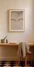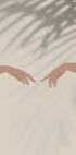 Una composizione serena e poetica che mostra due mani dolcemente tese che si protendono l'una verso l'altra, su un tranquillo sfondo beige con eleganti ombre di foglie di palma. Questa opera d'arte minimalista evoca temi di connessione, pace ed equilibrio, ideale per creare un'atmosfera calma e riflessiva nel tuo spazio.