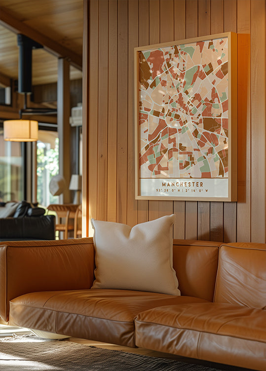 Black Maps Earth Tones 45 di Emiliano Deificus è una mappa stilizzata della città di Manchester nei toni tenui della terra e nero profondo. Le linee sottili rivelano strade e quartieri come un motivo grafico, dove contrasti e texture creano profondità. Un poster elegante e urbano che unisce calma ed energia cruda. Perfetto per la casa e l'ufficio moderni.
