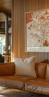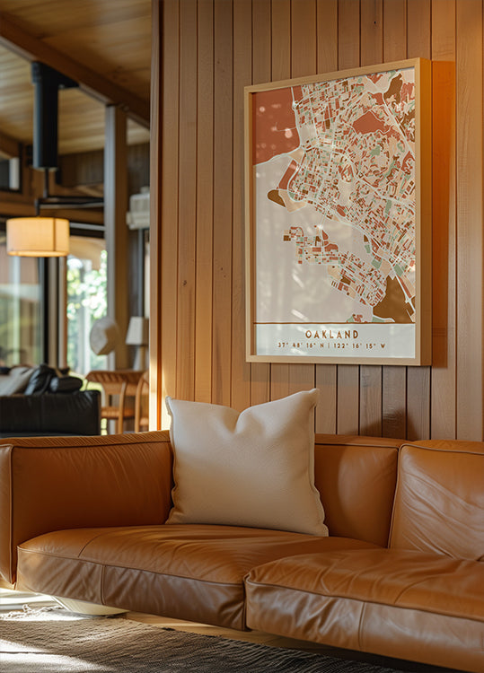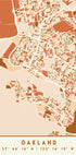 Elegante studio cartografico di Oakland, questa stampa di Emiliano Deificus riproduce le strade e il litorale della città con sfumature terrose su un nero profondo. Blocchi geometrici, trame sottili e indicazioni di latitudine e longitudine creano un paesaggio urbano calmo e moderno, perfetto per i minimalisti urbani e i cuori della Bay Area.