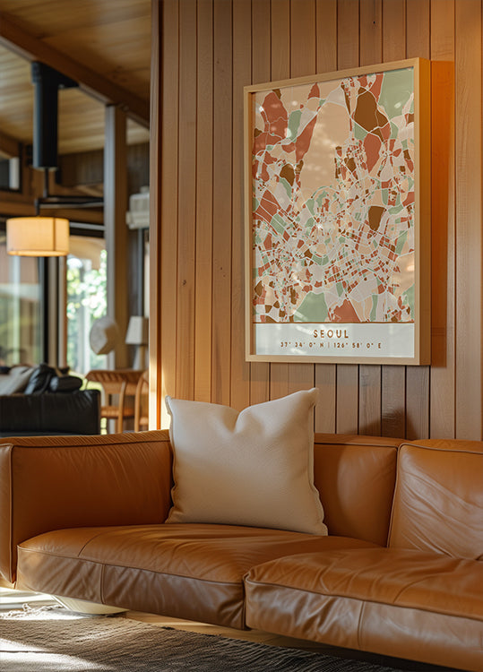 Un'elegante mappa scura di Seul nei toni della terra, dove la rete stradale, i quartieri e i contorni della città risaltano in una grafica dettagliata. La tavolozza tenue conferisce un'espressione calma e moderna che si adatta sia al soggiorno che all'ufficio. Parte della serie Black Maps Earth Tones, creata da Emiliano Deificus. Perfetto per gli amanti delle mappe e degli interni urbani.