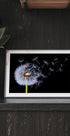 Un bellissimo primo piano di un dente di leone che rilascia i suoi semi nell'aria su uno sfondo scuro. La lanugine fluttuante simboleggia la libertà, la fragilità e la bellezza fugace, rendendo quest'opera d'arte una scelta poetica per qualsiasi arredamento.