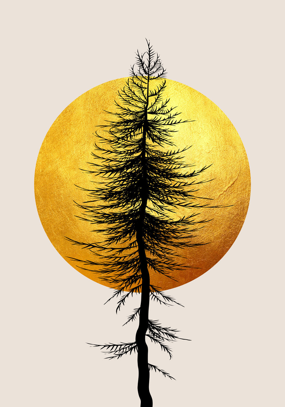 Un'accattivante composizione minimalista con un albero nero che si staglia contro un brillante sole dorato. Lo sfondo dorato strutturato crea un bellissimo contrasto con i rami delicati, donando un'estetica moderna e ispirata alla natura. Perfetto per gli amanti dell'elegante semplicità, dell'arredamento scandinavo e del design moderno.