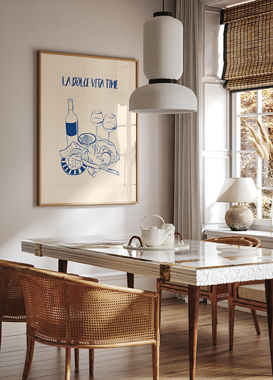 Un poster semplice e accogliente con vino, formaggio, frutta e pane, ispirato al Mediterraneo. Il testo "La Dolce Vita Time" racchiude la dolce vita, il relax e il fascino italiano. Ideale per la cucina.