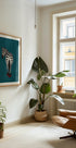 Questa opera d'arte moderna mostra una zebra in piedi su uno sfondo verde acqua, nota per le sue eleganti scarpe nere a tacco alto. La composizione surrealista mescola la fauna selvatica con la moda e crea un'espressione audace e giocosa che sfida la tradizionale arte animale.