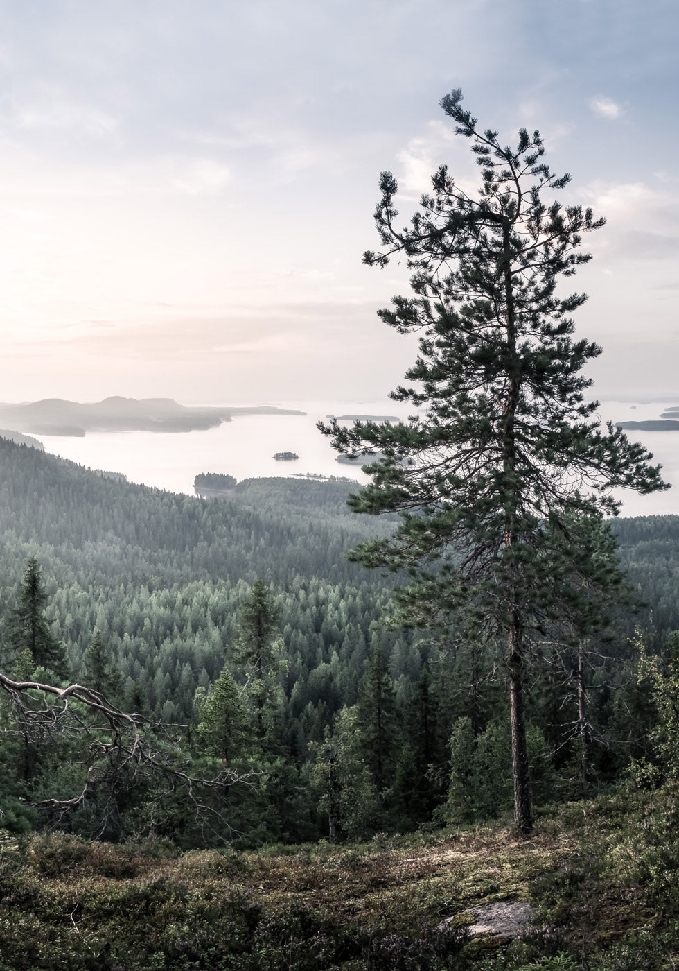 Un paesaggio sereno che cattura la bellezza di una foresta nordica che si affaccia su un grande lago. Un pino solitario si erge in primo piano, mentre infinite distese di conifere scompaiono nell'orizzonte nebbioso. Il cielo dai tenui colori pastello esalta l'atmosfera calma e sognante, rendendo quest'opera d'arte un complemento perfetto per un interno ispirato alla natura.