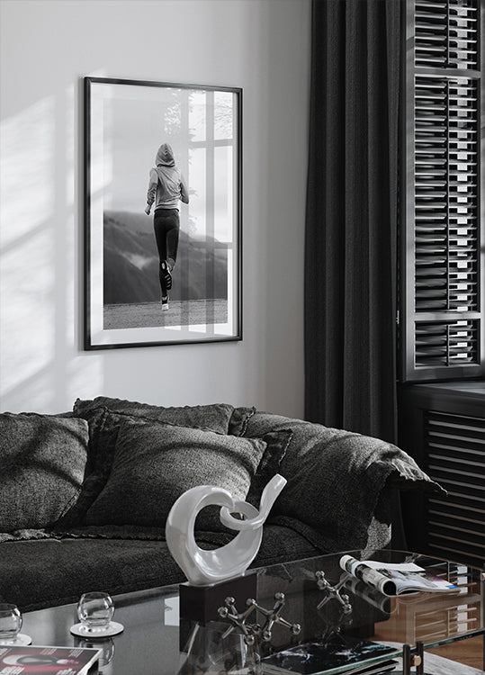Una straordinaria fotografia in bianco e nero che cattura l'essenza della tenacia e della determinazione. Raffigurante un corridore in movimento sullo sfondo di una montagna, quest'opera d'arte simboleggia forza, resistenza e determinazione. Un poster motivazionale perfetto per gli appassionati di fitness e per coloro che vivono uno stile di vita attivo.