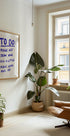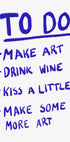 Un pezzo tipografico giocoso e motivazionale con una lista di "cose da fare" scritta a mano: Fai arte, bevi vino, bacia un po', fai più arte. Con un testo blu in grassetto su sfondo bianco, questo poster divertente e moderno combina umorismo, romanticismo e creatività, perfetto per coppie, artisti o chiunque ami vivere con passione.