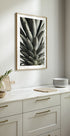 Un intenso primo piano di un ananas cattura le forme scultoree della corona di foglie e il motivo grafico del guscio in tonalità verde intenso e dorate. Il ritaglio stretto e l'illuminazione morbida dello studio creano un'espressione calma e moderna con una fresca energia tropicale e una consistenza sensuale che eleva lo spazio. Perfetto come punto focale in cucina o in soggiorno.