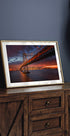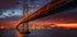 Una vista notturna mozzafiato del Bay Bridge di San Francisco illuminato in calde tonalità dorate sullo sfondo luminoso dello skyline della città. Il cielo drammatico al tramonto e i riflessi nell'acqua creano un paesaggio urbano impressionante, perfetto per gli amanti della città, dei viaggiatori e degli interni moderni.