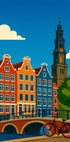 Sogna Amsterdam con questa illustrazione dai colori saturi di una bicicletta lungo un canale tranquillo, circondata da alberi e iconiche case a due spioventi. Le strisce del sole si riflettono nell'acqua mentre lo stile di viaggio retrò incontra il minimalismo moderno. Un'opera evocativa di Taudalpoi, perfetta per gli amanti della città. Un omaggio alla voglia di viaggiare, alla nostalgia e alla poesia dei colori nordici.