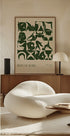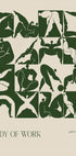 Un sorprendente poster figurativo di Arty Guava (2024), caratterizzato da audaci forme astratte del corpo in verde intenso su sfondo beige. L'opera d'arte esplora la forma, il movimento e l'espressione umana in uno stile grafico moderno.