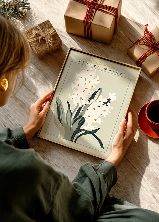 Un omaggio grafico ad Amsterdam: un giacinto stilizzato si erge come icona del mercato, circondato da caratteri tipografici audaci e fresche tonalità nordiche. Il poster bilancia la tranquillità invernale con la promessa della primavera. Progettato da Annick e creato per dare alla tua casa un fresco focus botanico con un fascino elegante e moderno. In tono scandinavo.