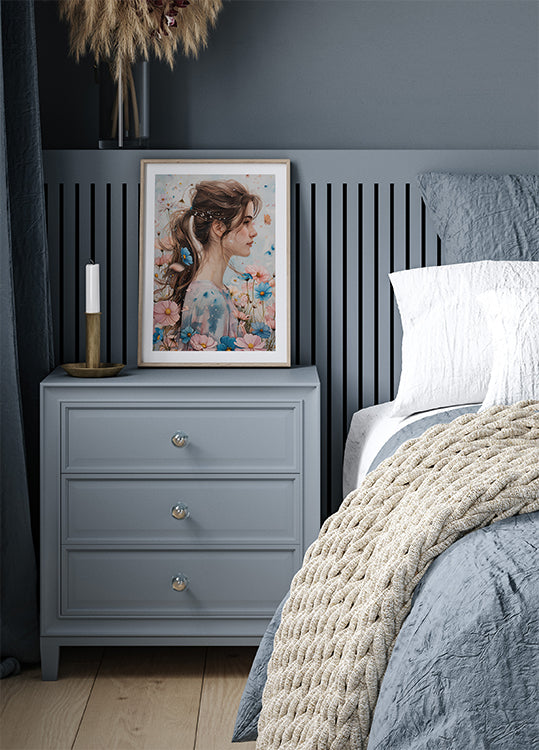 Un'opera d'arte ad acquerello sognante che ritrae una giovane donna serena, circondata da fiori in fiore dai colori pastello. Le delicate farfalle e le foglie fluttuanti evocano un senso di calma e contemplazione, perfetto per creare un'atmosfera armoniosa e stimolante.