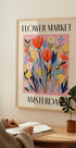 Un poster colorato in stile retrò con splendidi tulipani e fiori selvatici su un vivace sfondo rosa. Ispirata ai famosi mercati dei fiori di Amsterdam, questa opera d'arte combina la nostalgia del viaggio con il fascino botanico, perfetta per dare vita a qualsiasi arredamento.