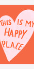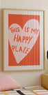 Questa opera d'arte presenta un cuore rosa disegnato a mano su uno sfondo arancione con le parole "Questo è il mio posto felice." Evoca positività e calore, perfetto per l'arredamento della casa o per spazi motivazionali.