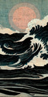 Una drammatica opera d'arte ondulata di ispirazione giapponese con uno stile vintage strutturato. Le potenti onde dell'oceano si alzano sotto un sole tenue, che unisce l'arte tradizionale con l'estetica moderna del Japandi. Perfetto per gli amanti dei paesaggi marini e dei tradizionali dipinti di onde.