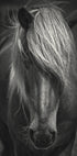 Uno straordinario ritratto in bianco e nero di un cavallo islandese, con la criniera che cade in avanti in un look elegante e spazzato dal vento. I toni monocromatici enfatizzano la consistenza grezza del pelo e la forza calma dell'animale, creando un ritratto animale audace ma intimo. Perfetto per gli amanti della natura e degli interni minimalisti.