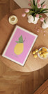 Una vivace opera d'arte pastello di un limone con foglie verdi su sfondo rosa, con il testo "le citron". Un poster da cucina moderno e giocoso, perfetto per aggiungere colore e freschezza alle tue pareti.