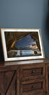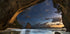 Una vista mozzafiato di Cathedral Cove in Nuova Zelanda, vista attraverso l'arco di roccia naturale che incornicia l'oceano al tramonto. Le onde calme, i riflessi luminosi e il cielo stellato creano un'atmosfera magica, perfetta per portare nella tua casa la bellezza e la tranquillità della costa.