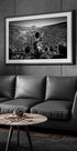 Una potente fotografia in bianco e nero che cattura l'atmosfera elettrica di uno stadio di calcio gremito. Un giovane tifoso con la maglia di Messi indica il campo, a simboleggiare la passione, l'eroismo e lo spirito unificante del gioco più bello del mondo. Quest'opera d'arte è un omaggio ai momenti euforici che rendono il calcio più di un semplice sport.