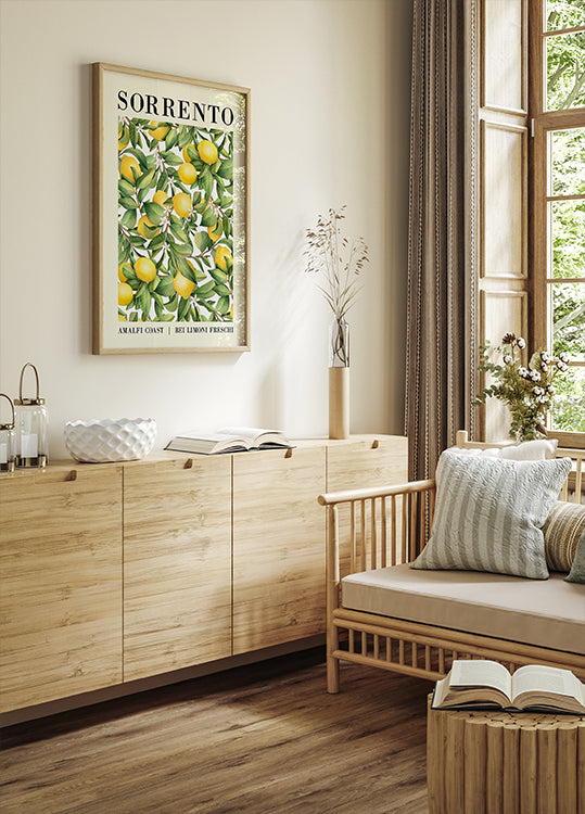 Un'illustrazione vivace e fresca di lussureggianti rami di limone di Sorrento, Italia. I limoni giallo pallido, le foglie verdi e i delicati fiori bianchi creano un'atmosfera mediterranea. Questa arte botanica aggiunge calore ed eleganza, perfetta per la cucina, la sala da pranzo o qualsiasi stanza con un debole per l'estetica amalfitana.