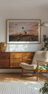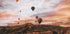 Un paesaggio mozzafiato della Cappadocia al tramonto con le mongolfiere che svettano nel cielo. I caldi colori del deserto e le nuvole drammatiche danno un senso di libertà e avventura, perfetto per decorazioni murali ispirate ai viaggi.
