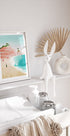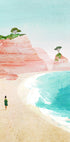 Una tranquilla illustrazione costiera con una figura solitaria che cammina lungo una spiaggia sabbiosa con onde turchesi e rocce rosse sullo sfondo. Ispirata alla costa dell'Algarve in Portogallo, quest'opera d'arte cattura la calma e l'armonia dell'estate in riva al mare.