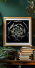 Un primo piano ipnotico di una rosetta di Sempervivum, con le foglie che si aprono in perfetta simmetria e tonalità verde intenso su uno sfondo scuro e tranquillo. L'ordine geometrico incontra la poesia organica e crea un effetto grafico e calmo. Fotografia di Victor Mozqueda, ideale per spazi moderni. Il contrasto evidenzia l'architettura e la tranquillità della pianta.
