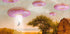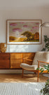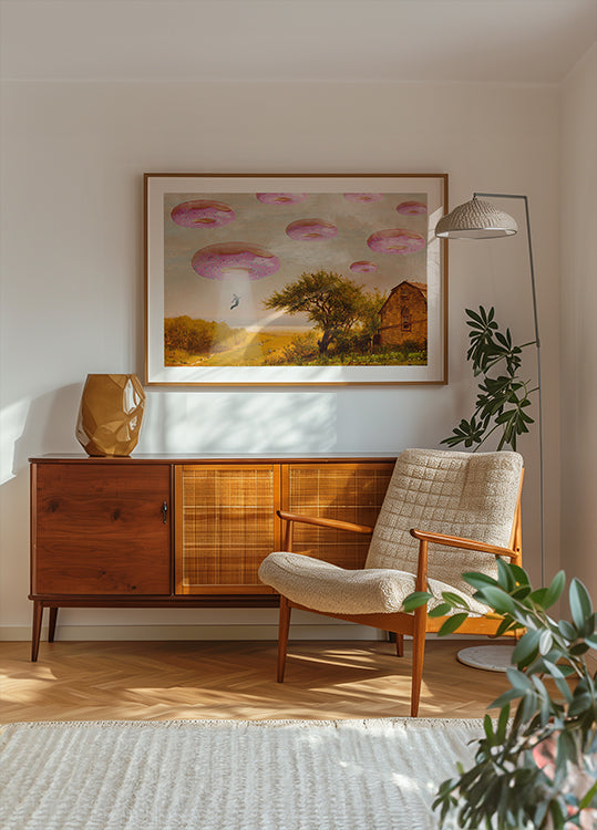 Un'opera d'arte surreale e divertente che mescola la classica pittura di paesaggio con l'assurdità della pop art: gigantesche ciambelle rosa fluttuano nel cielo come UFO, dove un raggio di luce risucchia una figura umana. Un mix spiritoso di paesaggio pastorale e parodia moderna, perfetto per gli amanti dell'arredamento divertente e dell'arte con un senso dell'immaginazione.