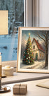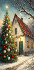 Un tranquillo motivo invernale con una casetta nella neve e un albero di Natale splendidamente decorato, splendente di luci calde. Una leggera nevicata cade sul palco, mentre le finestre illuminate e i bagliori dorati creano un'atmosfera natalizia tranquilla e nostalgica. Ideale per il soggiorno, l'ingresso o come parte tranquilla e festosa di una parete da galleria invernale.