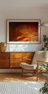 Un'opera d'arte astratta fiammeggiante che mescola sfumature di rosso, arancione e oro, evocando sia il flusso dell'acqua che l'intensità del fuoco. Con vortici pittorici e texture morbide, il pezzo irradia calore, passione ed energia, perfetto per interni audaci o come centrotavola drammatico.