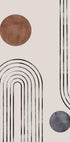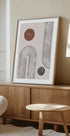 Un elegante poster astratto con forti forme geometriche, cerchi e linee nere curve su sfondo beige. Ispirata al design moderno della metà del secolo, questa opera d'arte minimalista combina equilibrio, ritmo ed eleganza, rendendola un pezzo versatile per interni moderni.