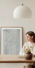 Un poster astratto minimalista con linee curve bianche specchiate simmetricamente su uno sfondo con texture grigio tenue. Ispirata all'estetica moderna della metà del secolo e a una tavolozza monocromatica, l'opera d'arte combina equilibrio e semplicità, perfetta per interni contemporanei e spazi di ispirazione scandinava.