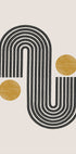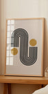 Un design astratto moderno e minimalista con audaci linee curve nere che formano archi combinati con forme circolari dorate su uno sfondo semplice. Combinando l'estetica retrò della metà del secolo con lo stile contemporaneo, questa opera d'arte geometrica è una dichiarazione perfetta per gli interni moderni.
