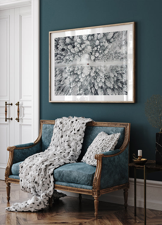 Manifesto di un'auto rossa che attraversa una foresta innevata