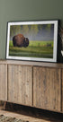 Una suggestiva fotografia naturalistica di un bisonte solitario in piedi in un prato nebbioso all'alba. Scattata a Yellowstone, l'immagine mette in risalto la forza pura e la maestosità di uno degli animali più iconici d'America, circondato dalla serena bellezza della luce del mattino.
