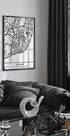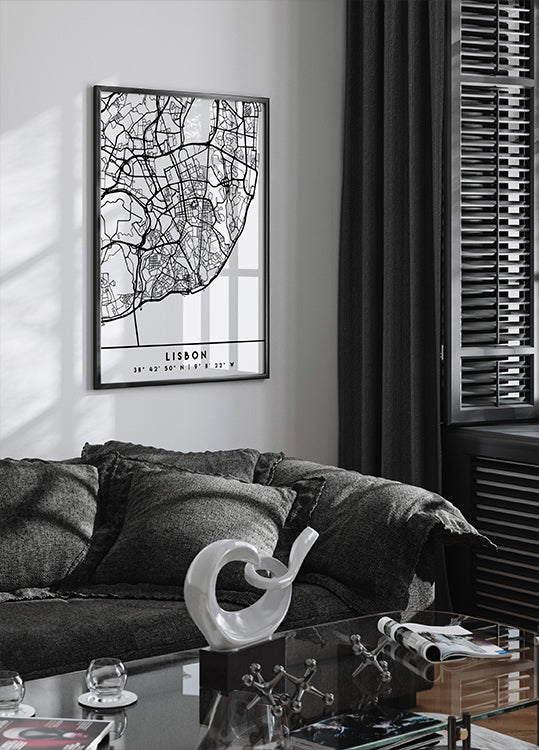 Black Maps 39 è l'elegante tributo di Emiliano Deificus a Lisbona: una composizione di mappa cittadina monocromatica dove strade, quartieri e linee del fiume disegnano un ritmo tagliente e geometrico. Il contrasto enfatizza la precisione delle coordinate e il dinamismo della città e crea un'espressione grafica moderna per la casa urbana. Perfetto per un arredamento minimal.