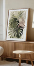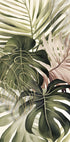 Un'elegante composizione botanica con lussureggianti foglie tropicali in tenui sfumature verdi con tocchi di rosa e dettagli dorati. Il design combina foglie di palma esotiche e monstera per un look moderno di ispirazione boho, perfetto per aggiungere freschezza ed eleganza a qualsiasi arredamento.