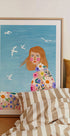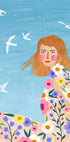 Un'illustrazione stravagante e colorata di una donna avvolta in un mantello floreale contro un cielo azzurro. Circondata da uccelli in volo, l'opera evoca libertà, gioia e il fresco spirito della primavera. Leggendario, ma anche calmo, unisce natura e fantasia in uno stile moderno e vivace.