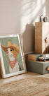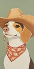 Un'opera d'arte giocosa e affascinante di un cane beagle vestito da cowboy, con un ampio cappello e una bandana fantasia. Questo divertente ritratto di animali combina lo stile rustico occidentale con un umorismo leggero, perfetto per gli amanti dei cani e le stravaganti collezioni di arte da parete.
