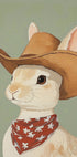 Un'opera d'arte adorabile e giocosa di un coniglio vestito da cowboy, con un ampio cappello e una bandana fantasia. Questo divertente ritratto di animali combina il fascino rustico occidentale con l'umorismo fantasioso, perfetto per gli amanti degli animali e per l'arredamento stravagante della casa.