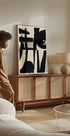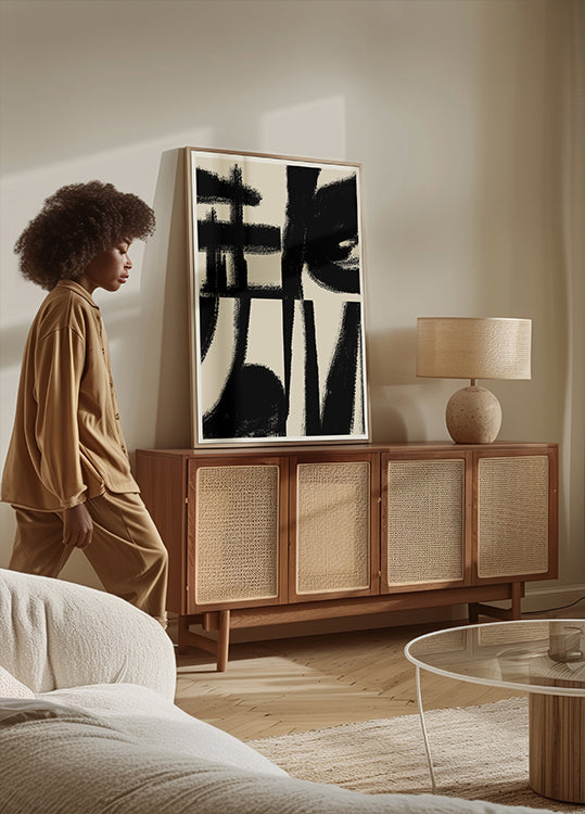 Una sorprendente opera d'arte astratta monocromatica con forti pennellate nere su uno sfondo neutro. Le linee strutturate e le forme espressive creano un equilibrio dinamico tra movimento e immobilità, rendendolo una dichiarazione moderna nell'arredamento contemporaneo.