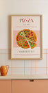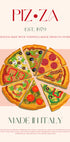 Questa opera d'arte di ispirazione retrò mostra un'illustrazione colorata di pizza a fette con vari condimenti come olive e peperoni. Con il testo "PIZZA", fondato nel 1979, mette in risalto l'impasto fresco fatto in casa e le autentiche origini italiane.