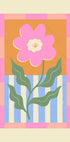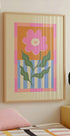 Il giocoso poster di fiori rosa è un'illustrazione di fiori affascinante e allegra con un design di ispirazione retrò. Mostra un grande fiore rosa chiaro con morbidi petali e foglie verdi, su uno sfondo arancione caldo con strisce blu e bianche, incorniciato da un bordo a scacchi rosa. La composizione trasuda ottimismo e giocosità, rendendola perfetta per interni moderni, eclettici o di ispirazione vintage. Ideale per ravvivare cucine, camere da letto o spazi creativi, aggiunge un tocco di colore e allegria a qualsiasi parete dipinta.